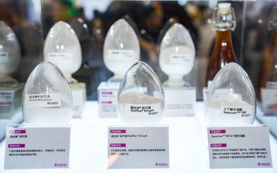 除了益生菌产品,赢创蔚蓝还同时在售一些功能型添加剂,包括继承自赢创的用于促进养殖动物能量代谢的光蜜诺胍基乙酸,以及同在此次展会上新推出的SpeoCare™ T60三丁酸甘油酯。