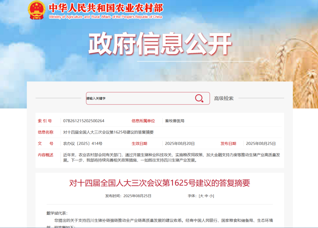 在其《关于支持四川生猪补链强链推动全产业链高质量发展的建议》中,主要涉及开展生猪种业技术攻关、在西南区域推广非粮饲料种植、支持种养循环并鼓励养殖主体开展碳汇交易、设立生猪产业链专项再贷款四个方面的内容,农业农村部经商中国人民银行、国家粮食和储备局、生态环境部后一一给予答复。