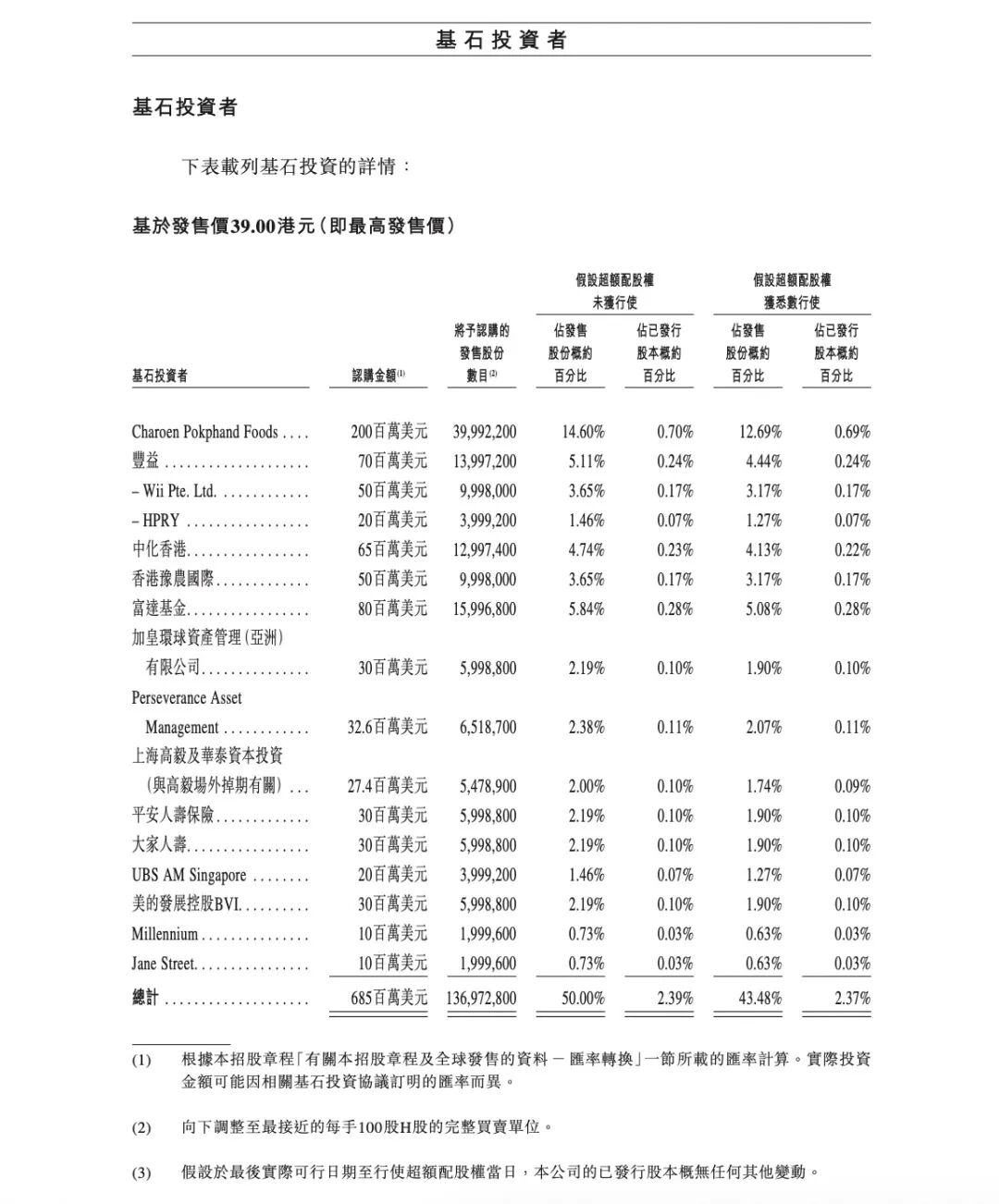招股书显示,该公司在此之前已引入了包括正大集团、丰益国际、中国中化在内的14家基石投资者,这些投资者拟认购一半的牧原H股,占到其全球发售完成后已发行股份总数的2.39%。按最高发售价计,这些股份的市值将达到约53.42亿港元或6.85亿美元。