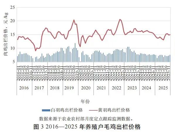 然而,去年肉鸡价格却是整体大幅下跌,产业链利润大幅缩减。据介绍,2025年我国白羽肉鸡平均出栏价格为7.28元/kg,较2024年下降6.60%;出栏价格处于近10年来低位运行状态,且在2月和7月分别出现近15%和10%的大幅下跌,年末则持续回升,至12月已同比2024年基本持平,为7.63元/kg。